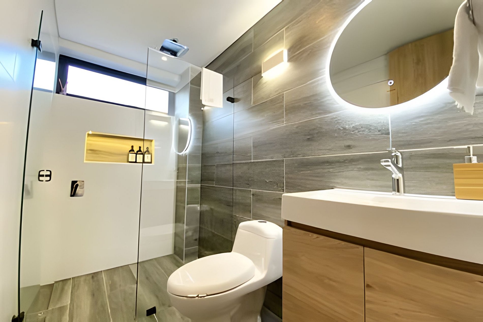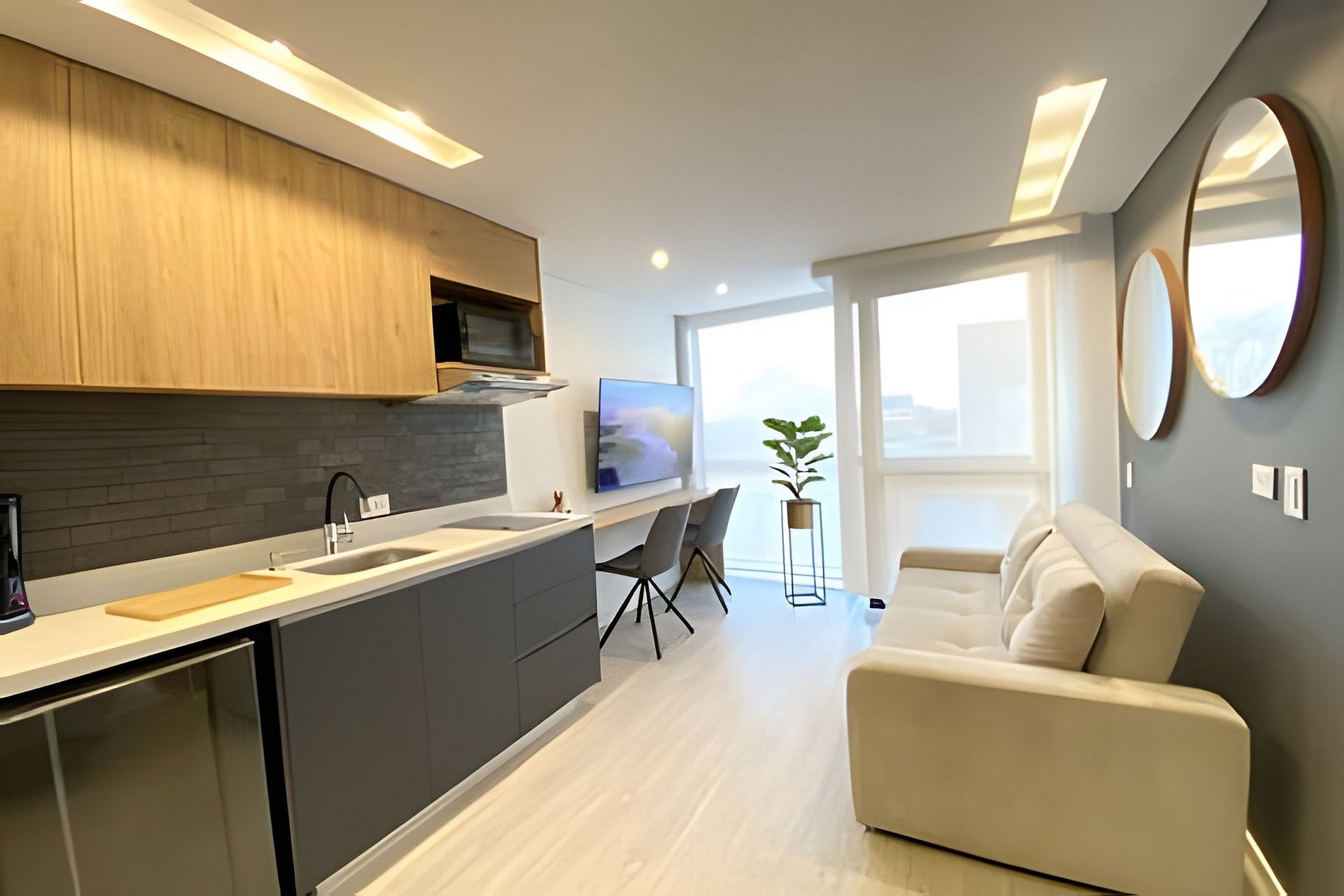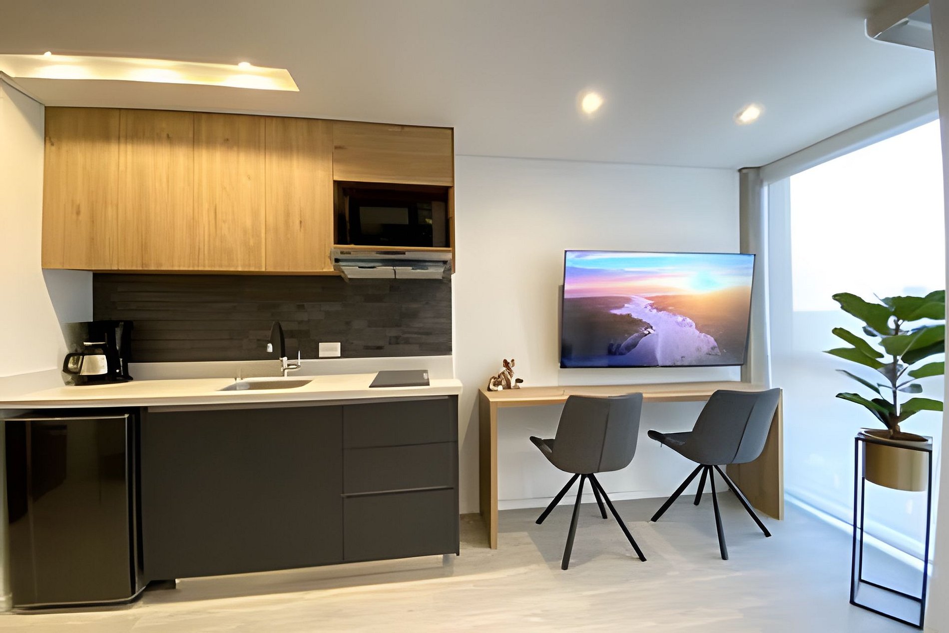 Apartamentos equipados con cocina completa, sala, Wi-Fi de alta velocidad y Smart TV.