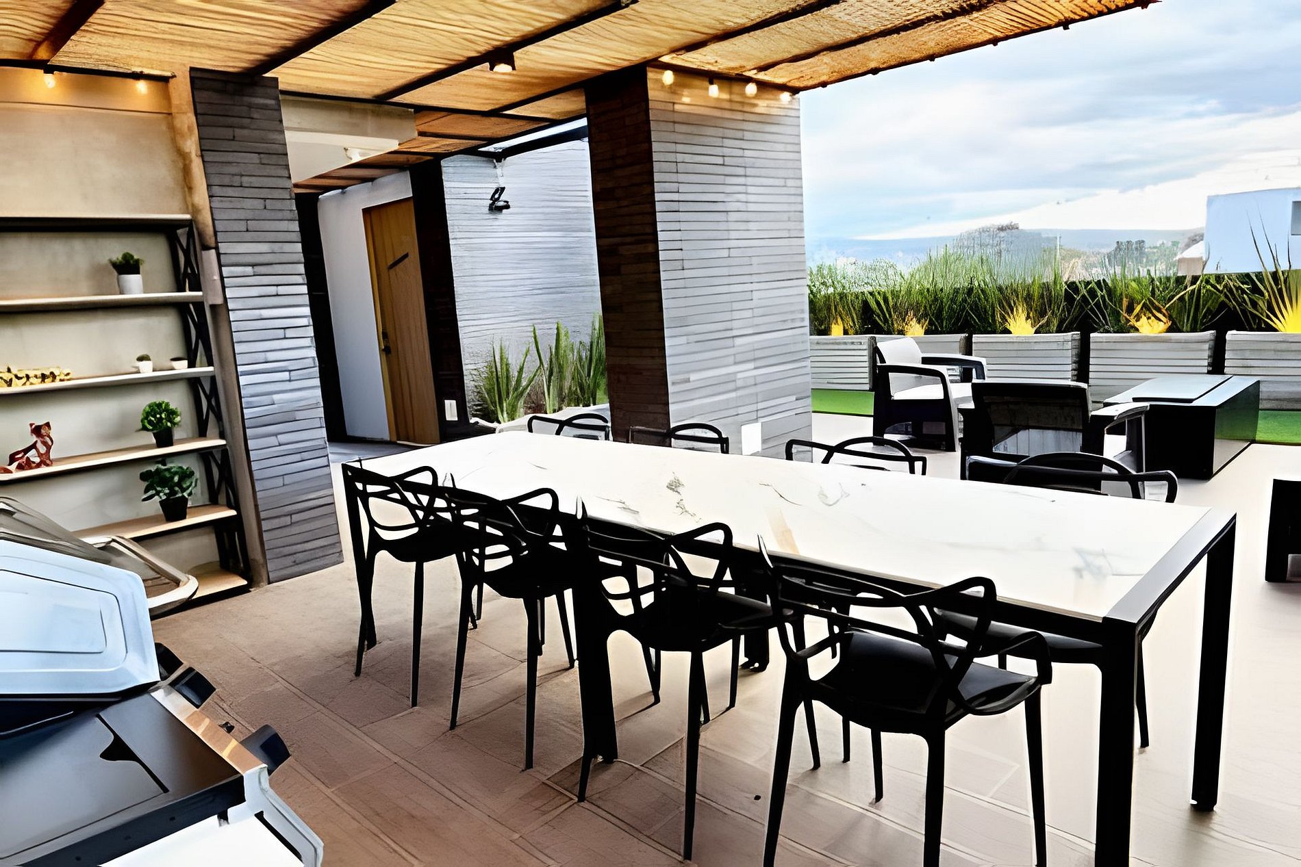 Terraza comunal con vista a la ciudad, perfecta para relajarte, compartir un café o disfrutar de un momento tranquilo al aire libre.