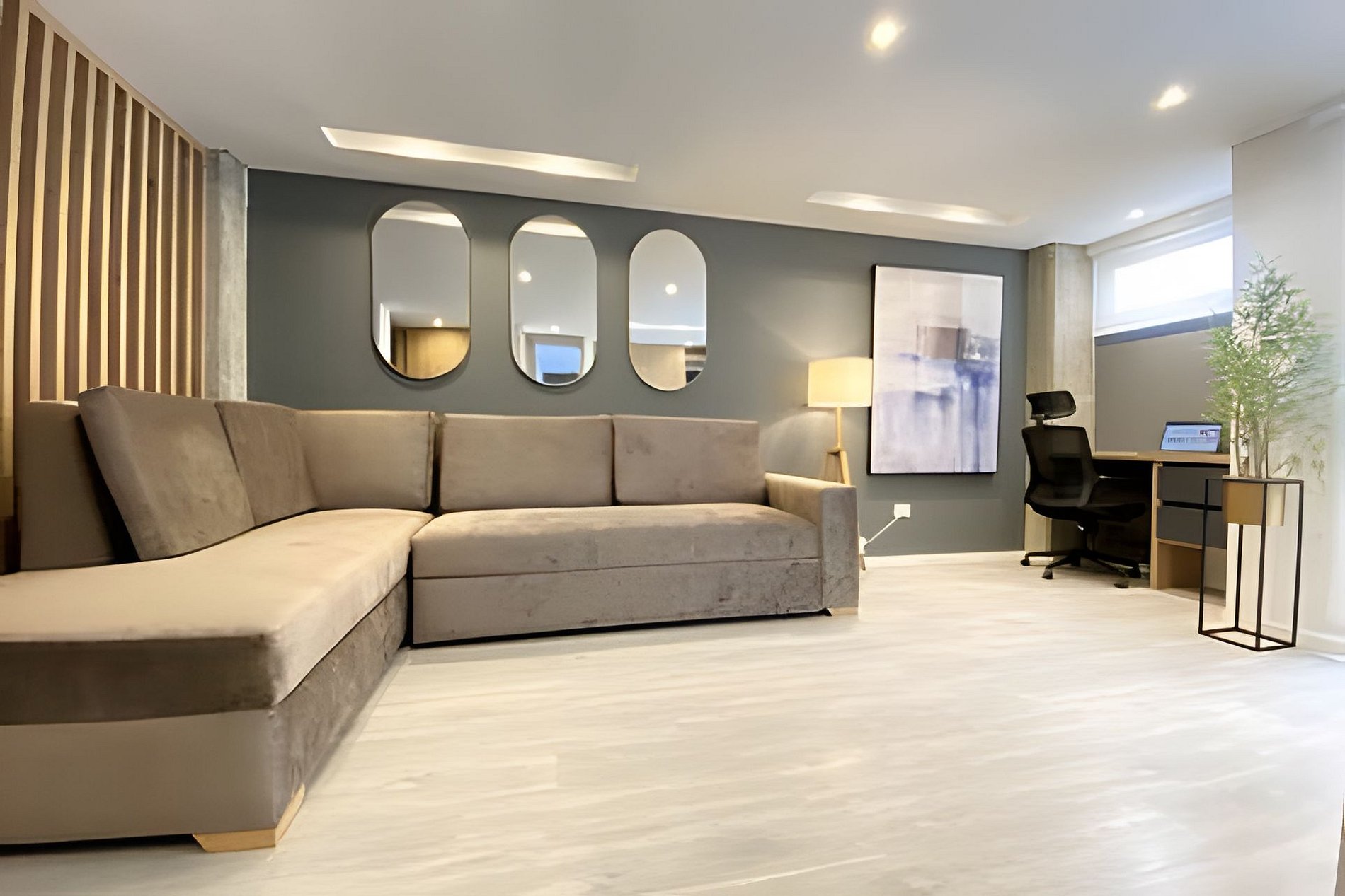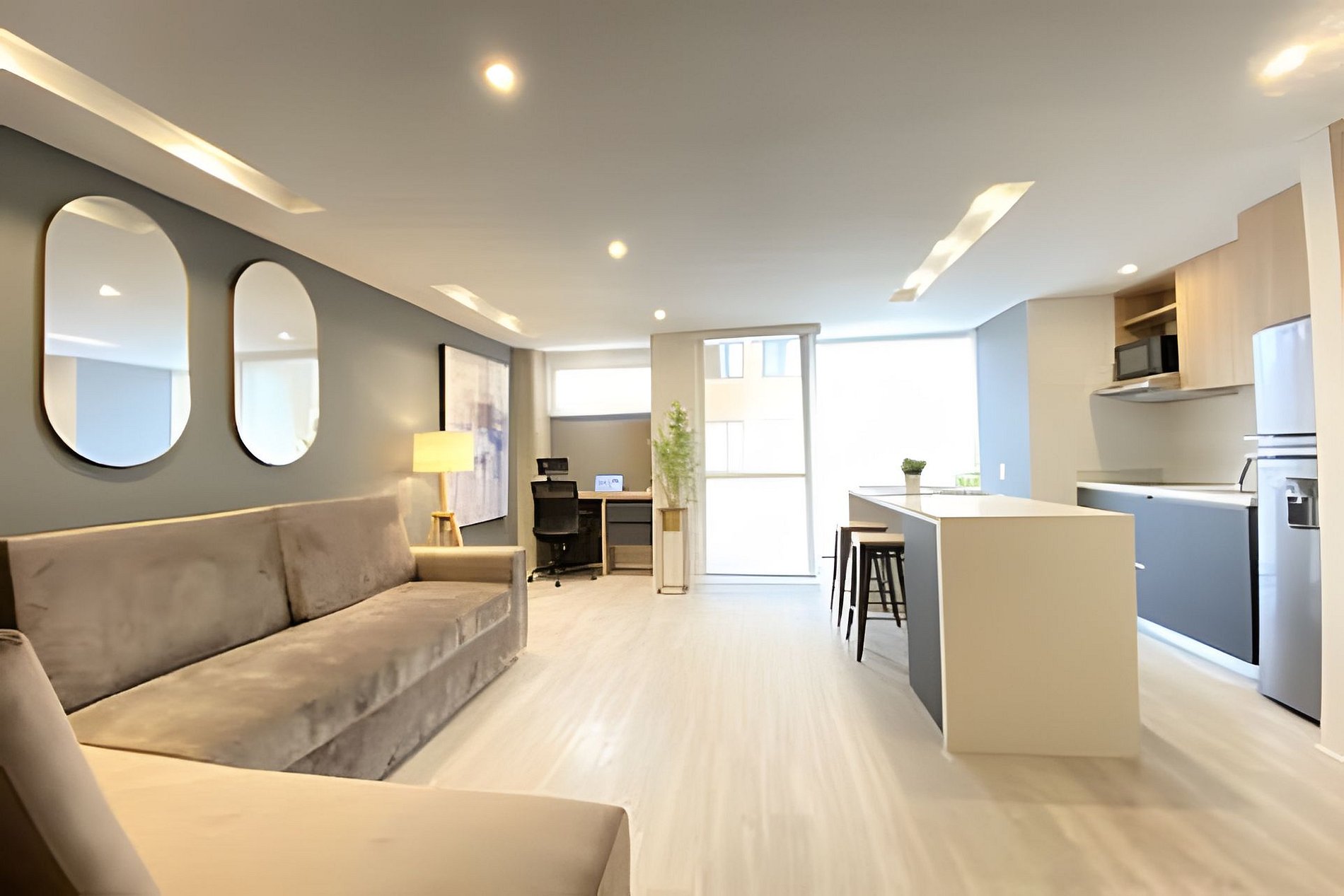 Apartamentos equipados con cocina completa, sala, Wi-Fi de alta velocidad y Smart TV.