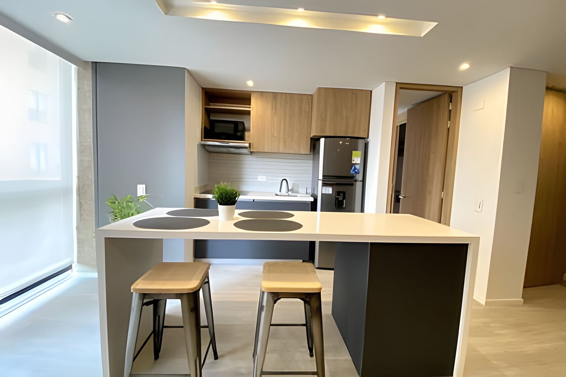 Espectacular Apartamento con diseño distintivo que lo hace único en la zona. Cuenta con 2 alcobas cada una con baño y ducha , balcón y una almplia sala . Disfruta de una espectacular terraza comunal con fireplace, BBQ y zona de coworking . En sus cercanías, hallarás comercios, universidades, transporte público, restaurantes, el Movistar Arena y el estadio. Experimenta la fusión perfecta entre comodidad y practicidad en nuestro hogar. LAMENTABLEMENTE NO TENEMOS PARQUEADERO.