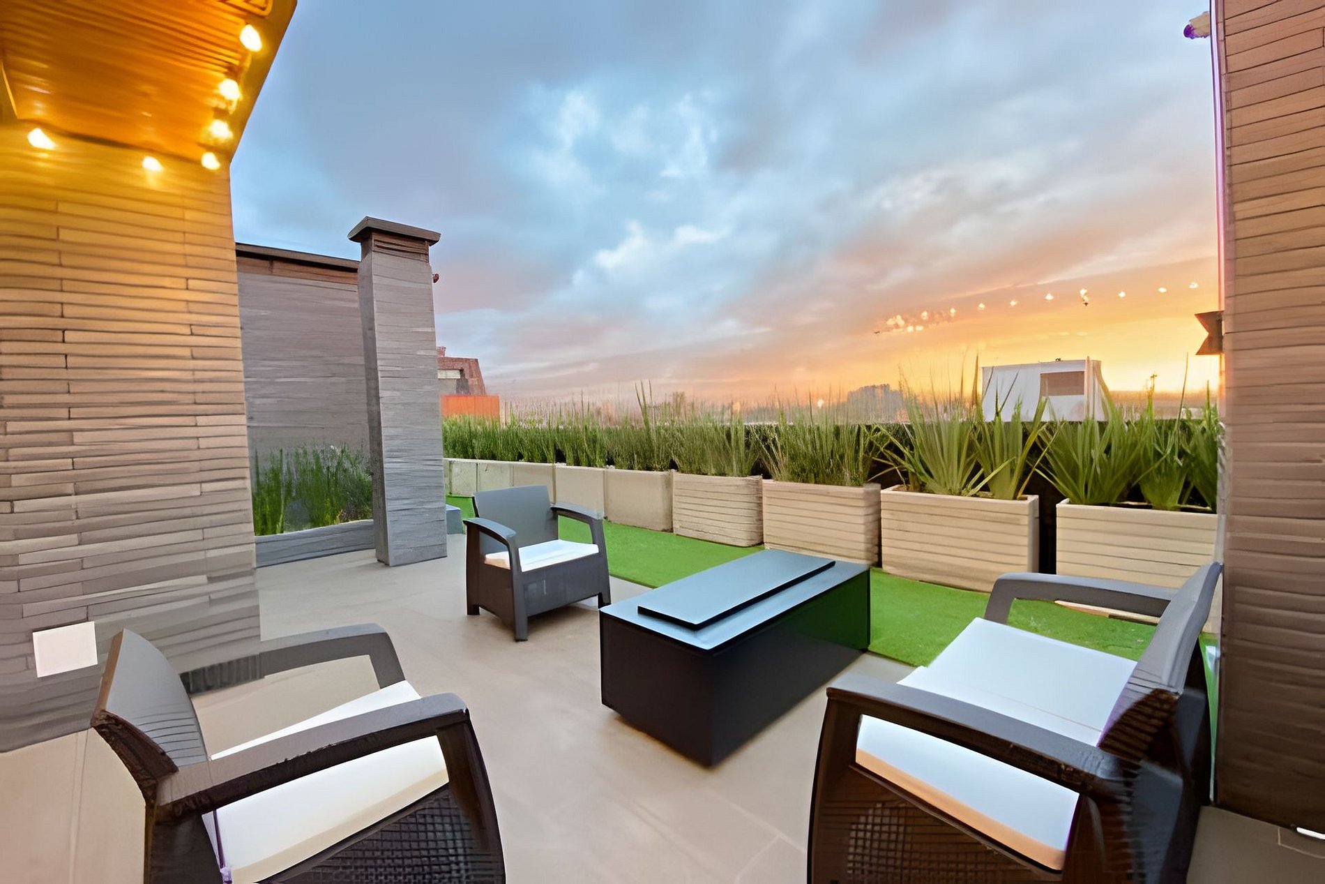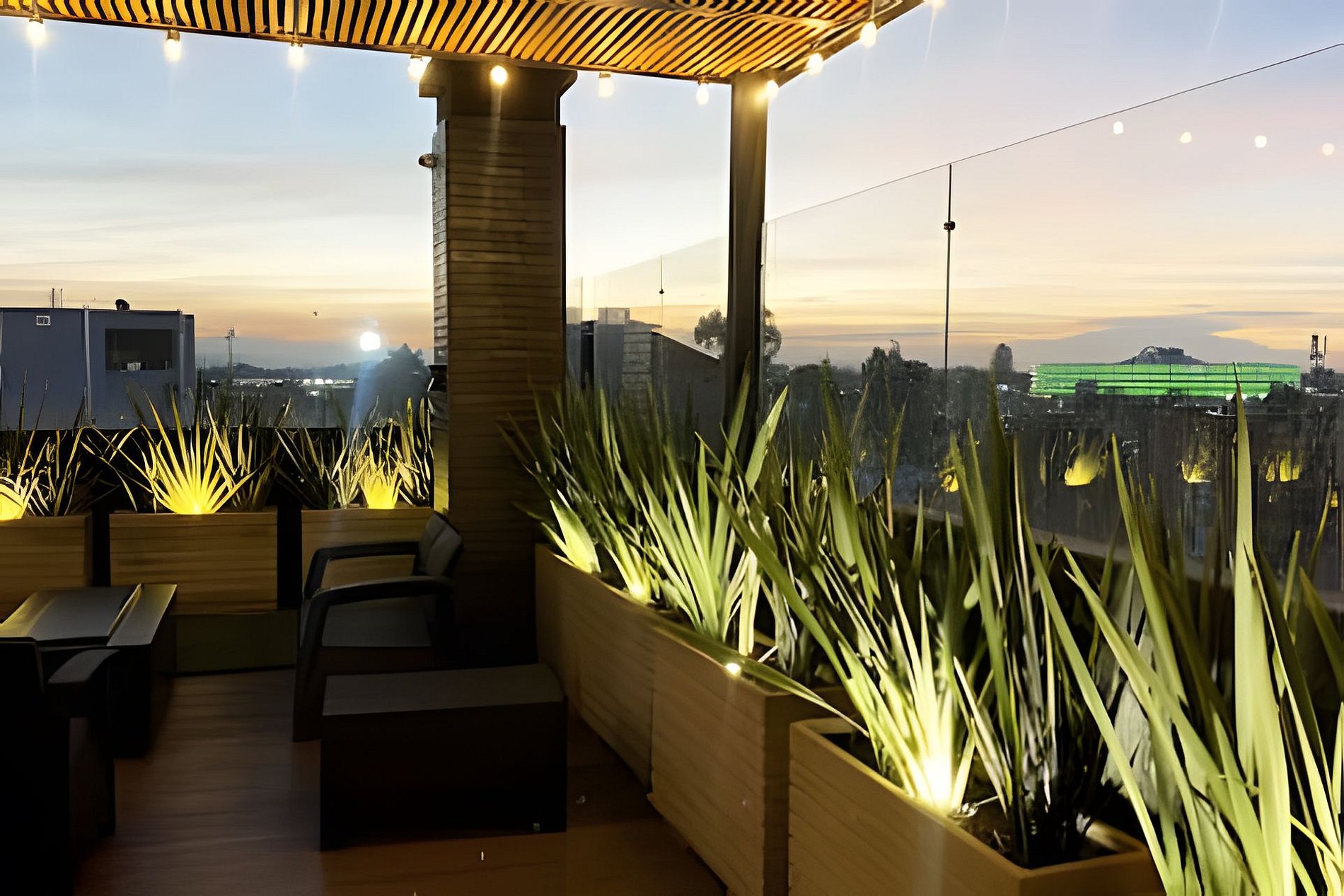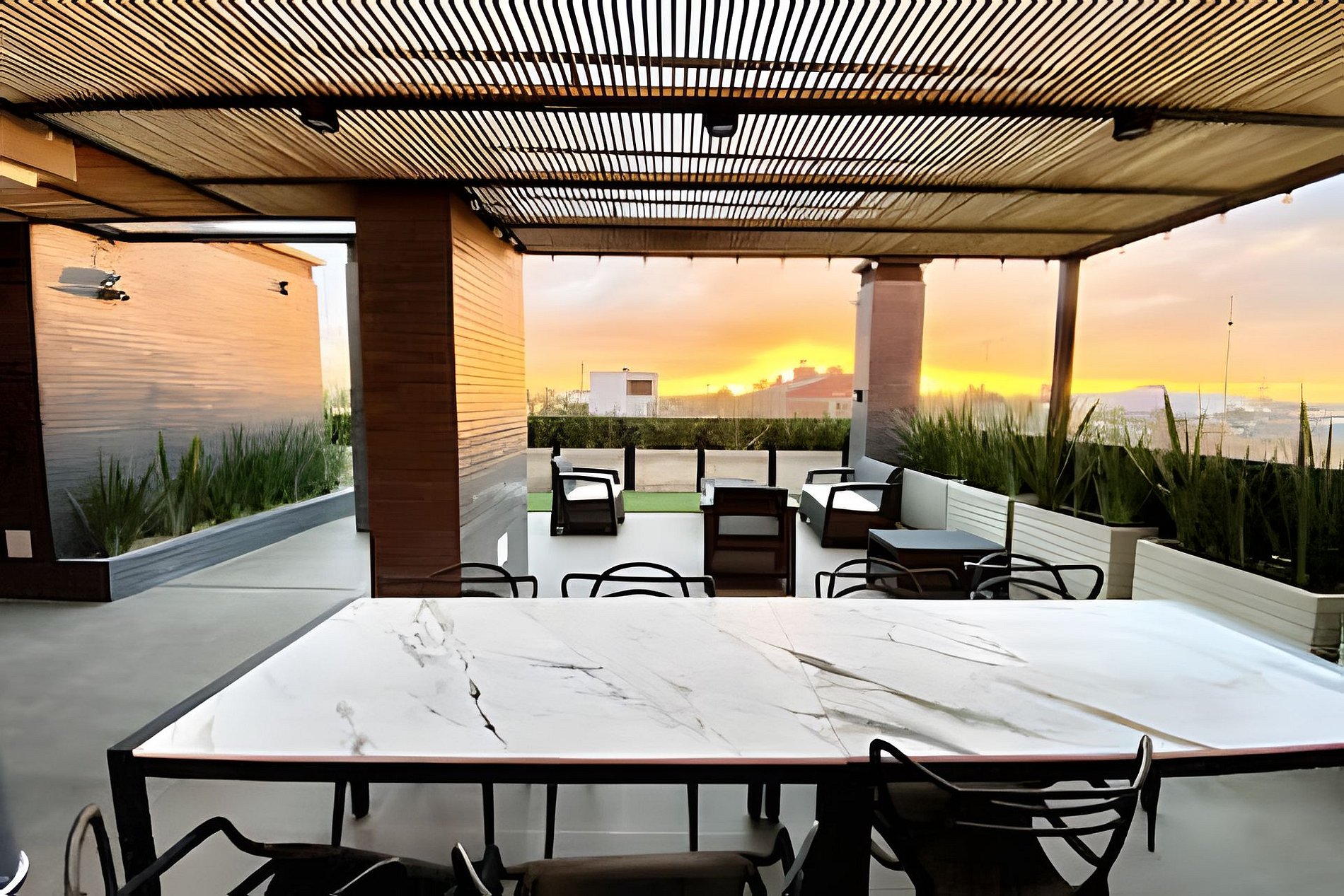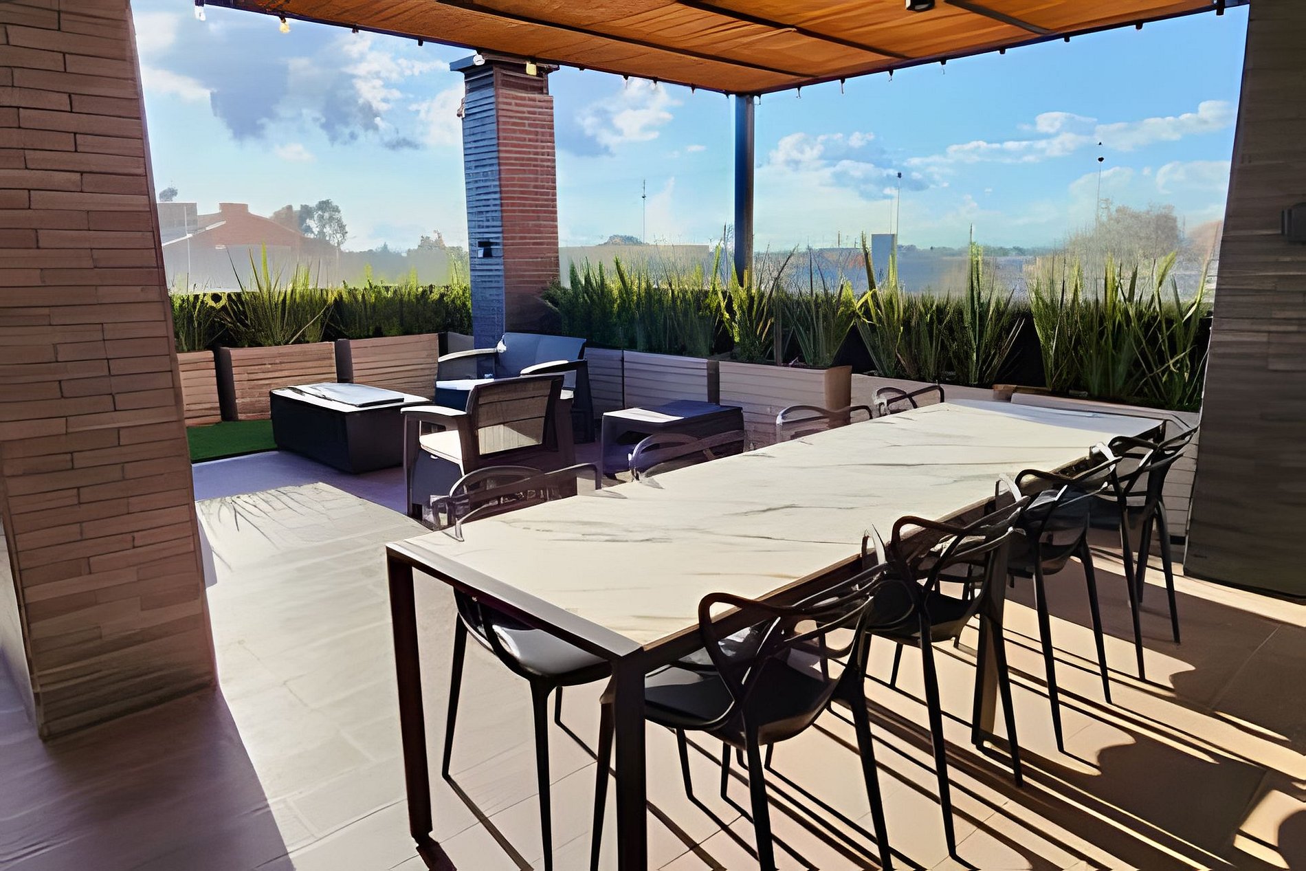 Terraza comunal con vista a la ciudad, perfecta para relajarte, compartir un café o disfrutar de un momento tranquilo al aire libre.