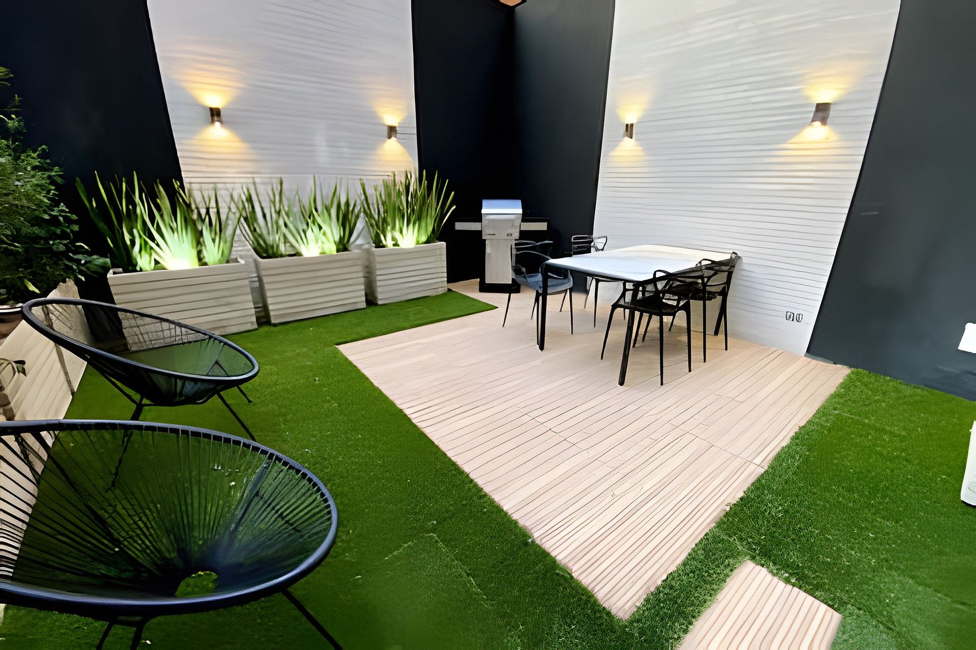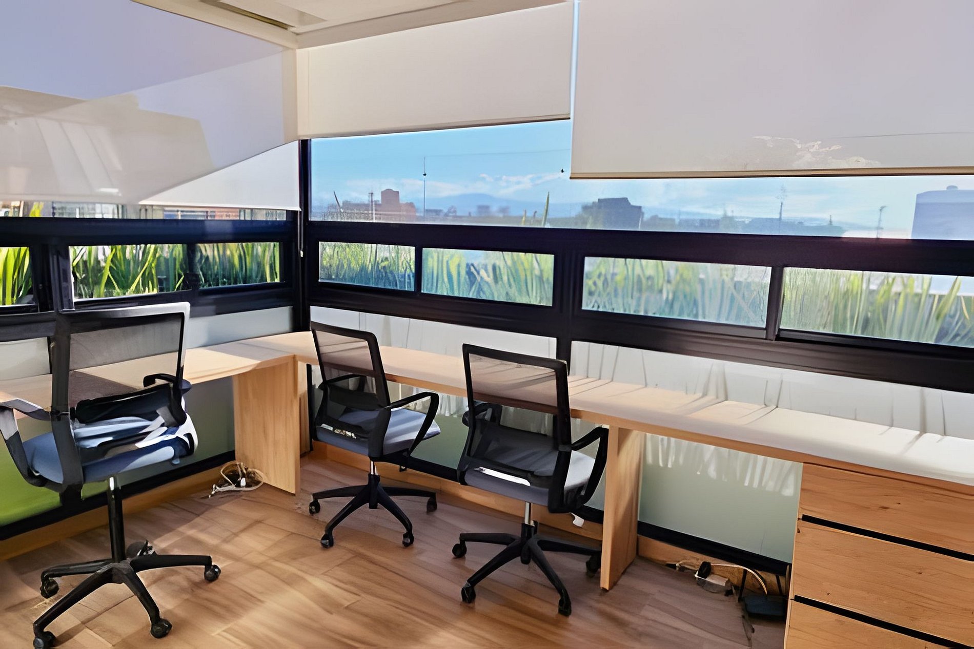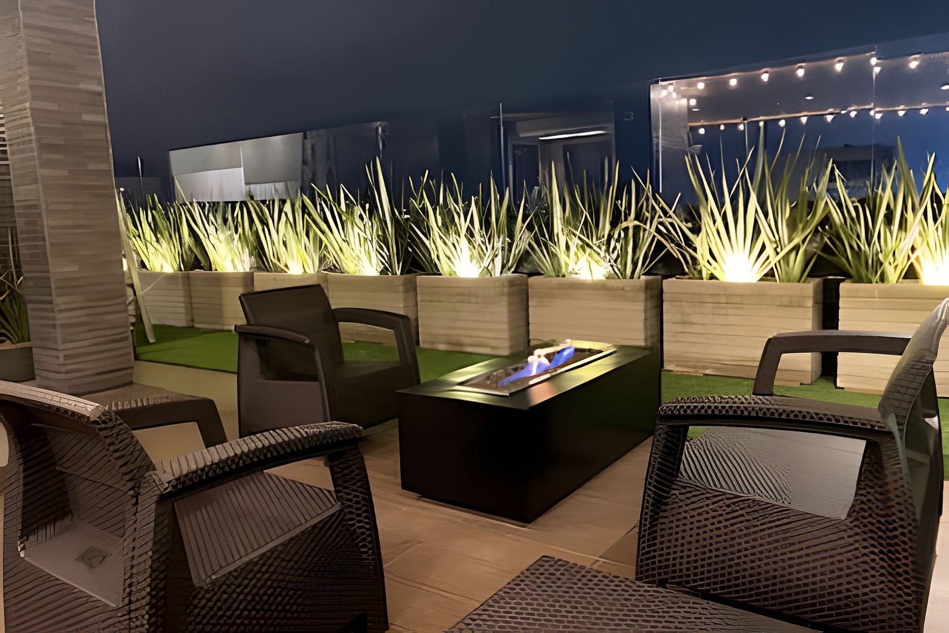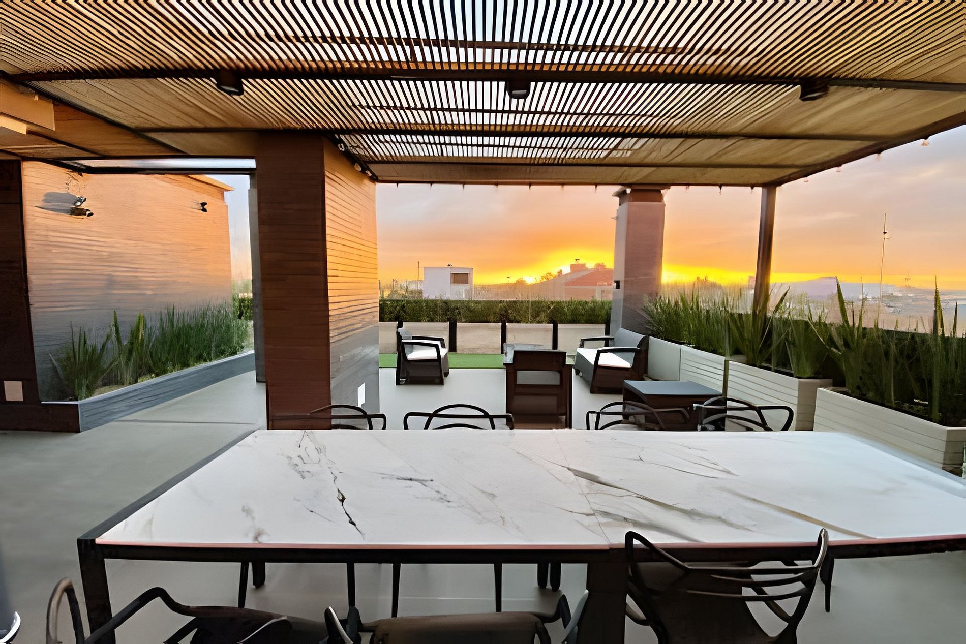 Terraza comunal con vista a la ciudad, perfecta para relajarte, compartir un café o disfrutar de un momento tranquilo al aire libre.