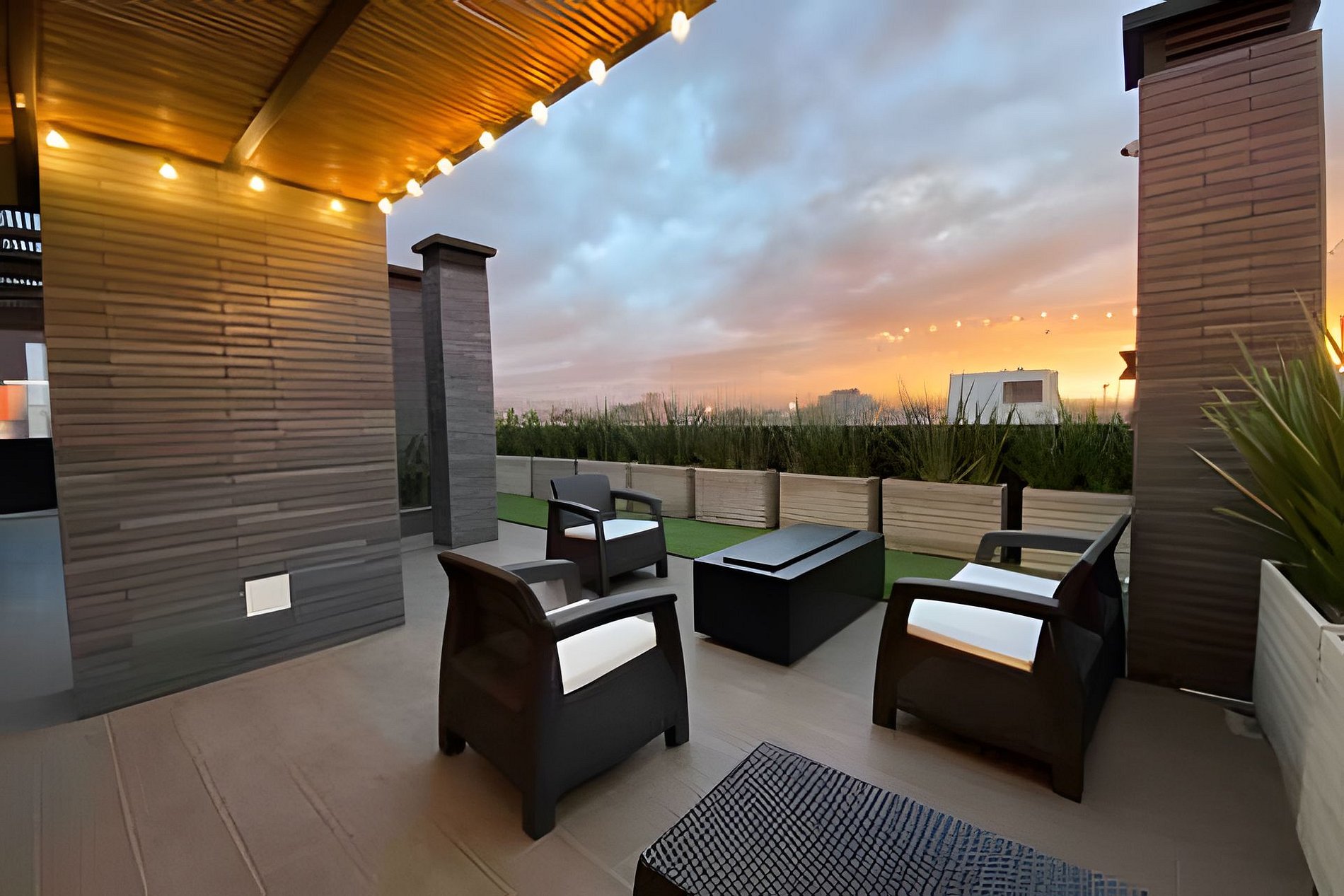 Terraza comunal con vista a la ciudad, perfecta para relajarte, compartir un café o disfrutar de un momento tranquilo al aire libre.