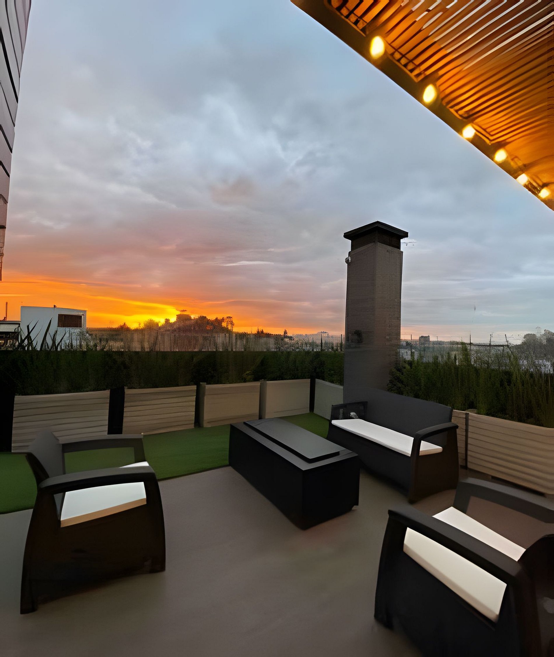 Terraza comunal con vista a la ciudad, perfecta para relajarte, compartir un café o disfrutar de un momento tranquilo al aire libre.