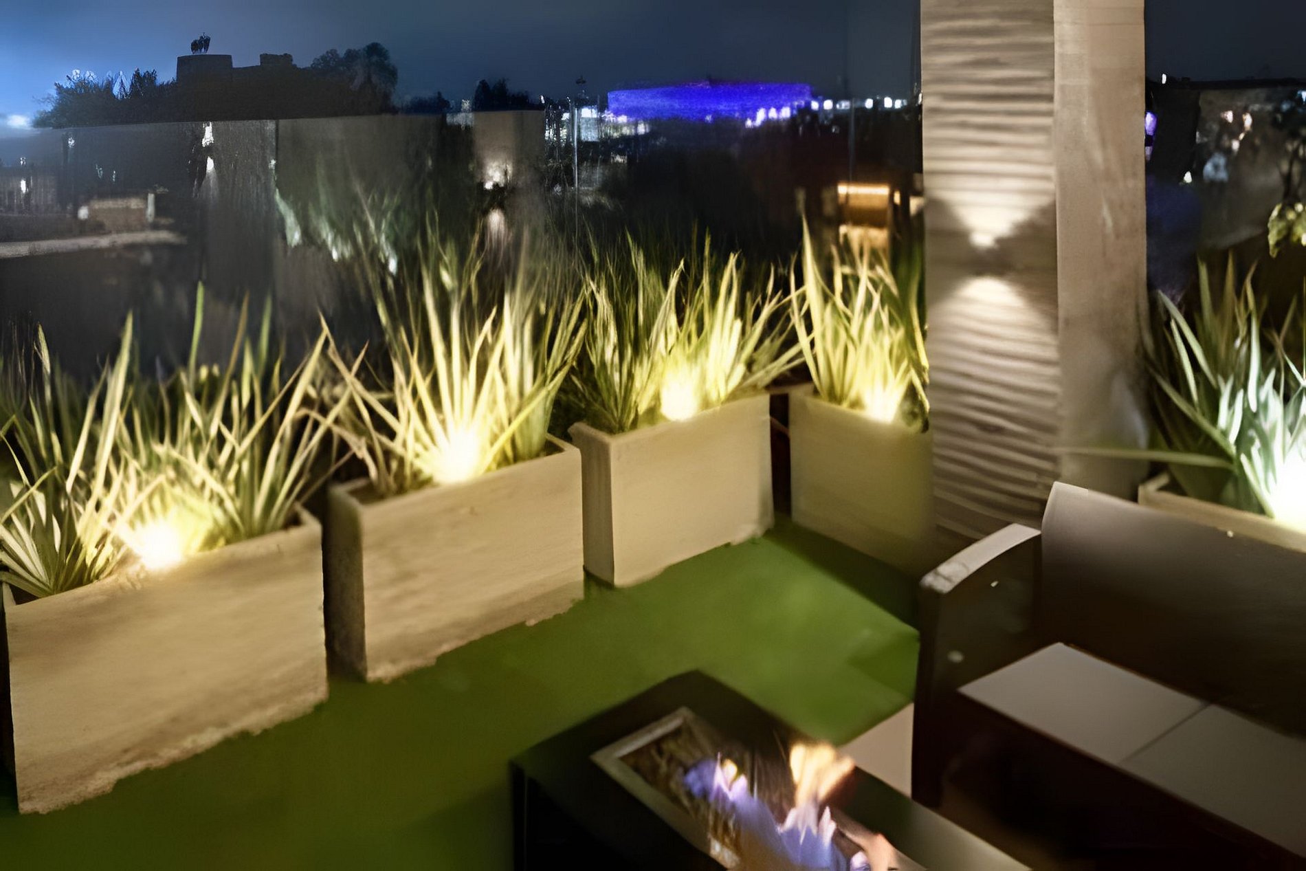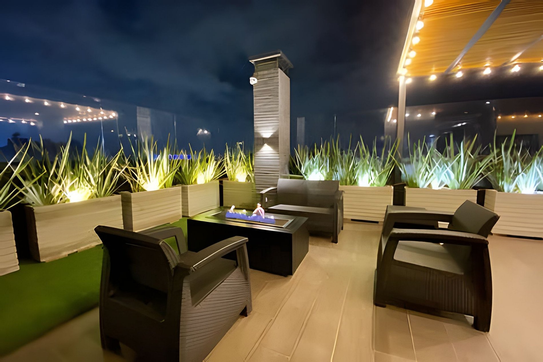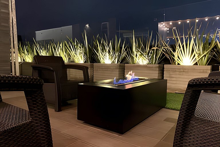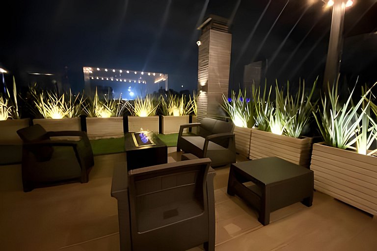 Terraza comunal con vista a la ciudad, perfecta para relajarte, compartir un café o disfrutar de un momento tranquilo al aire libre.