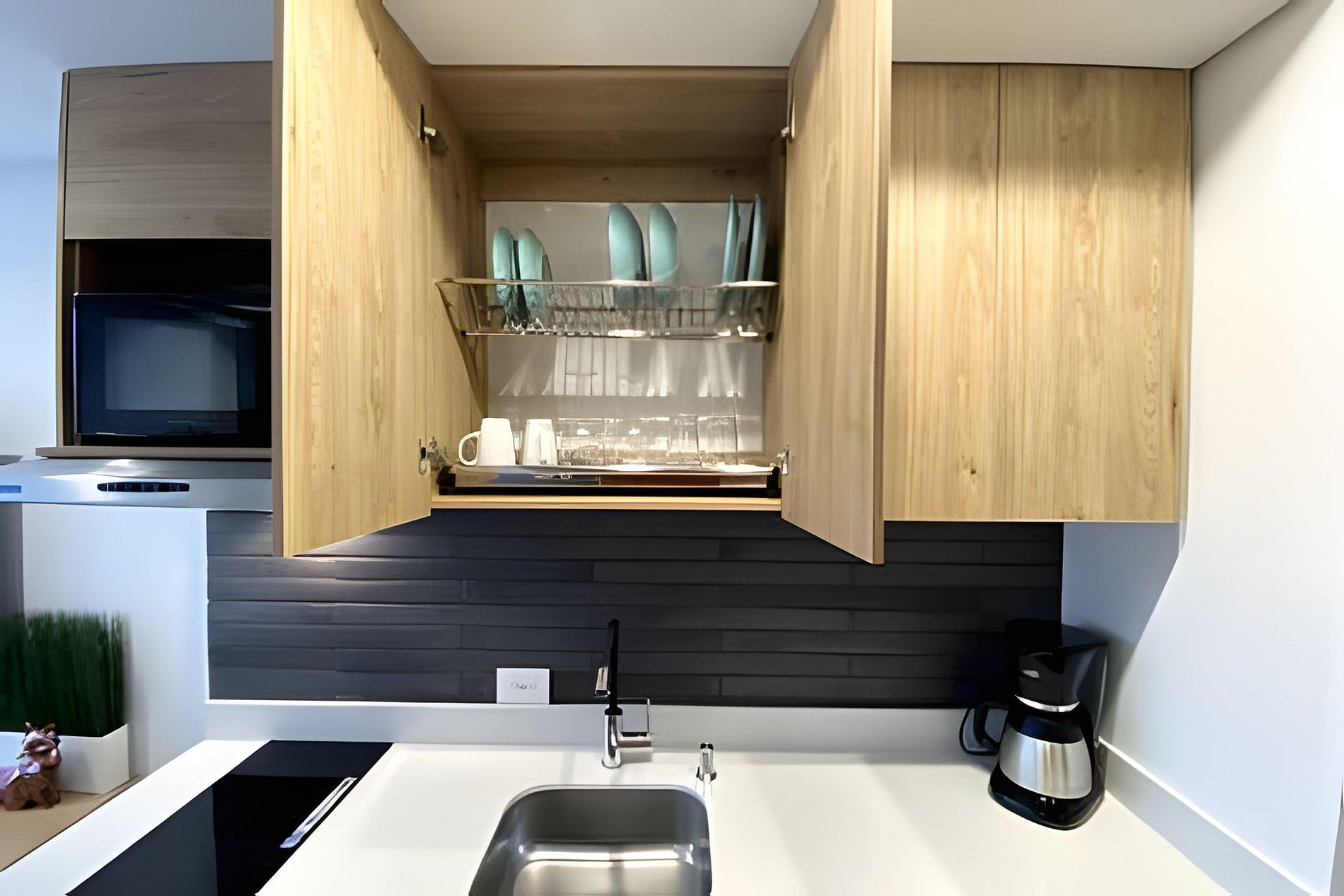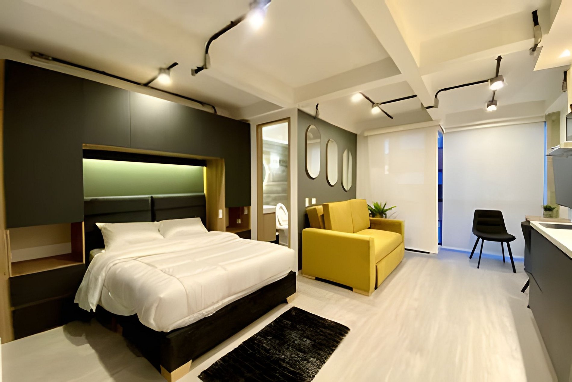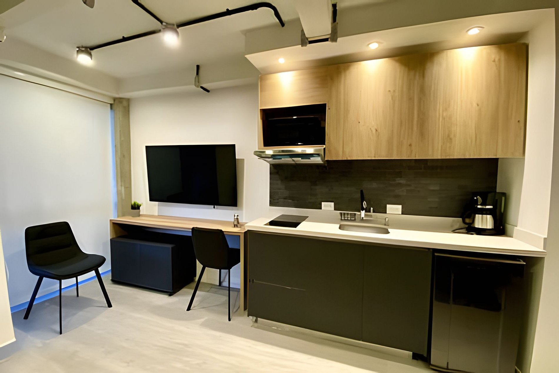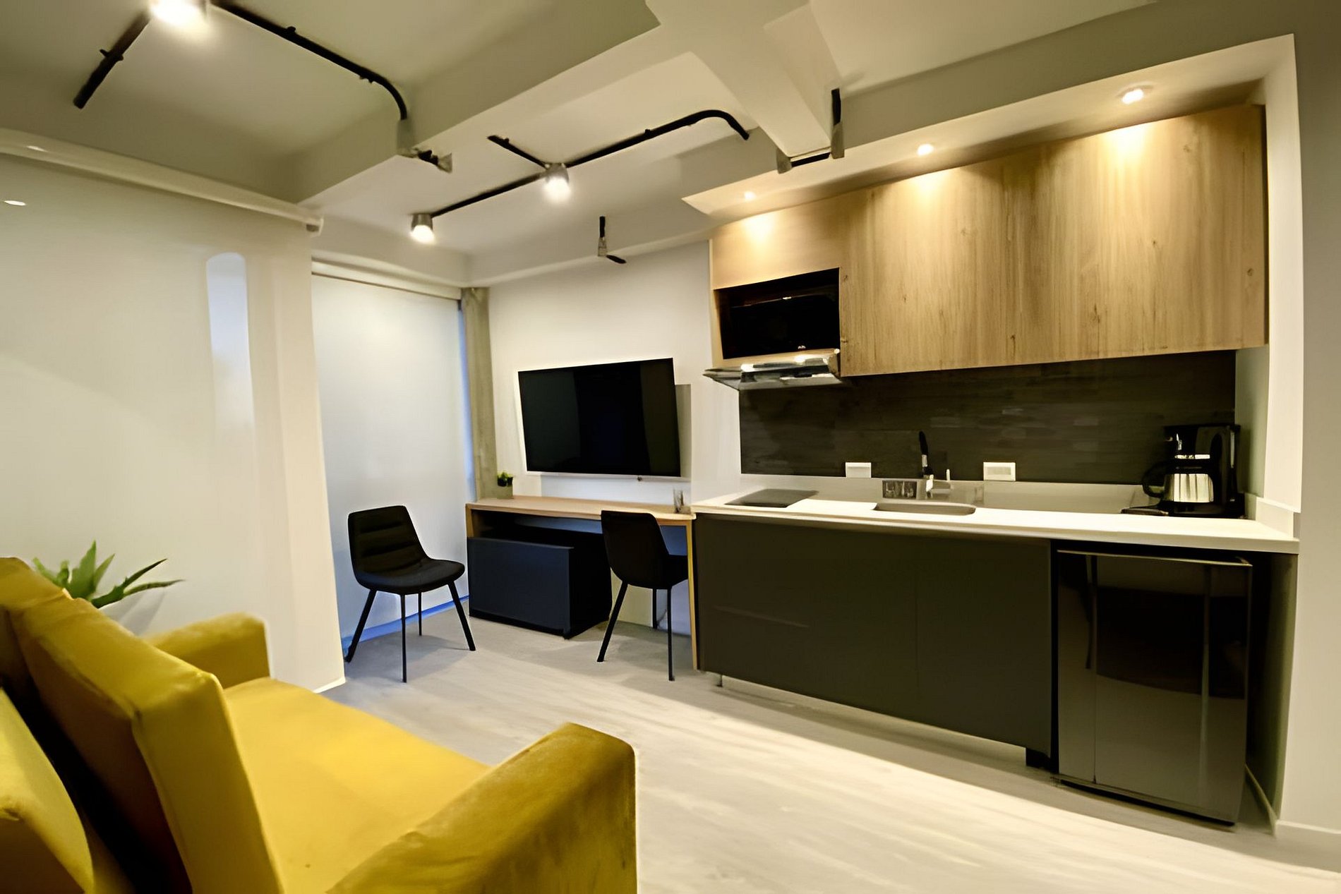 Apartamentos equipados con cocina completa, sala, Wi-Fi de alta velocidad y Smart TV.