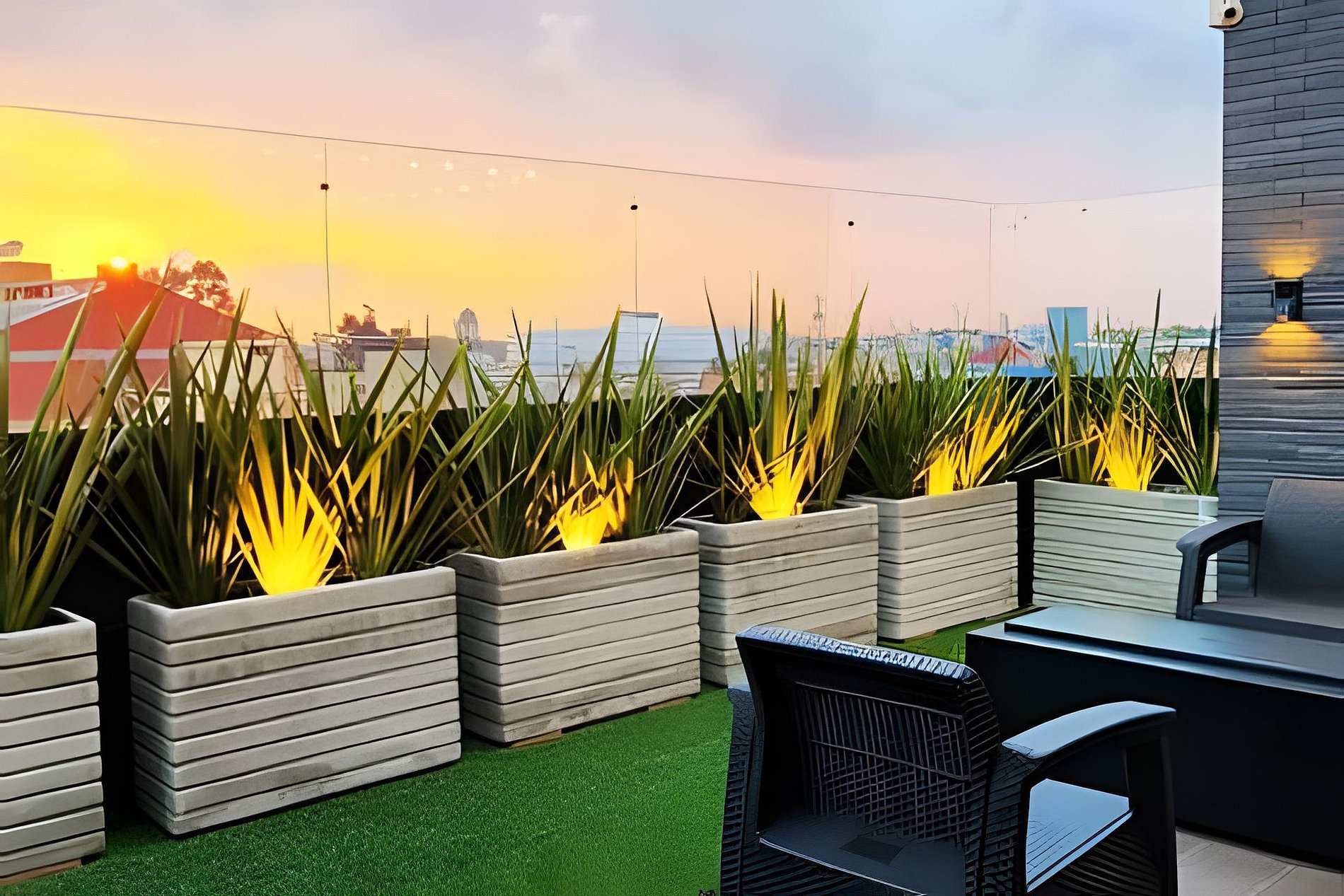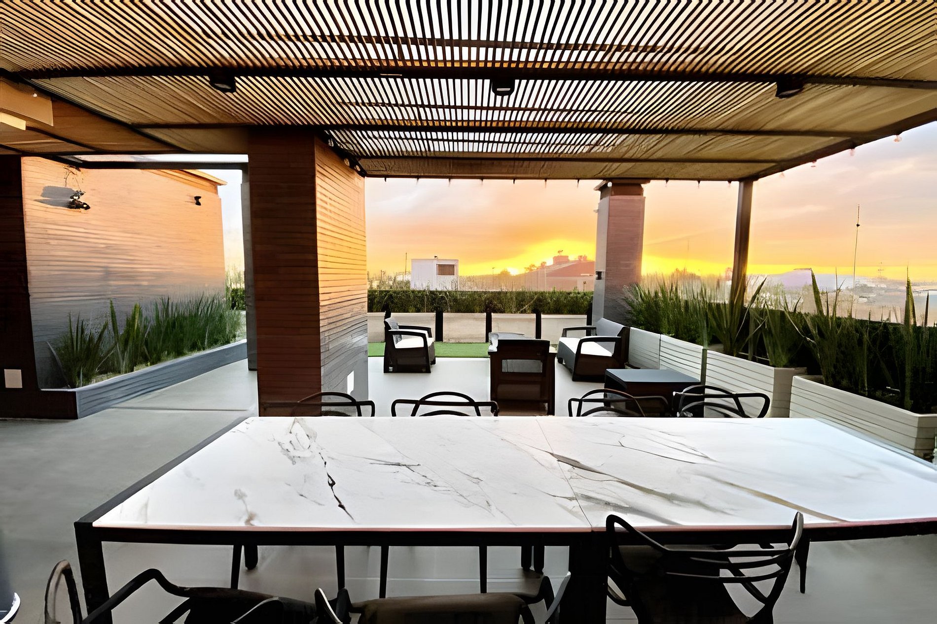 Terraza comunal con vista a la ciudad, perfecta para relajarte, compartir un café o disfrutar de un momento tranquilo al aire libre.