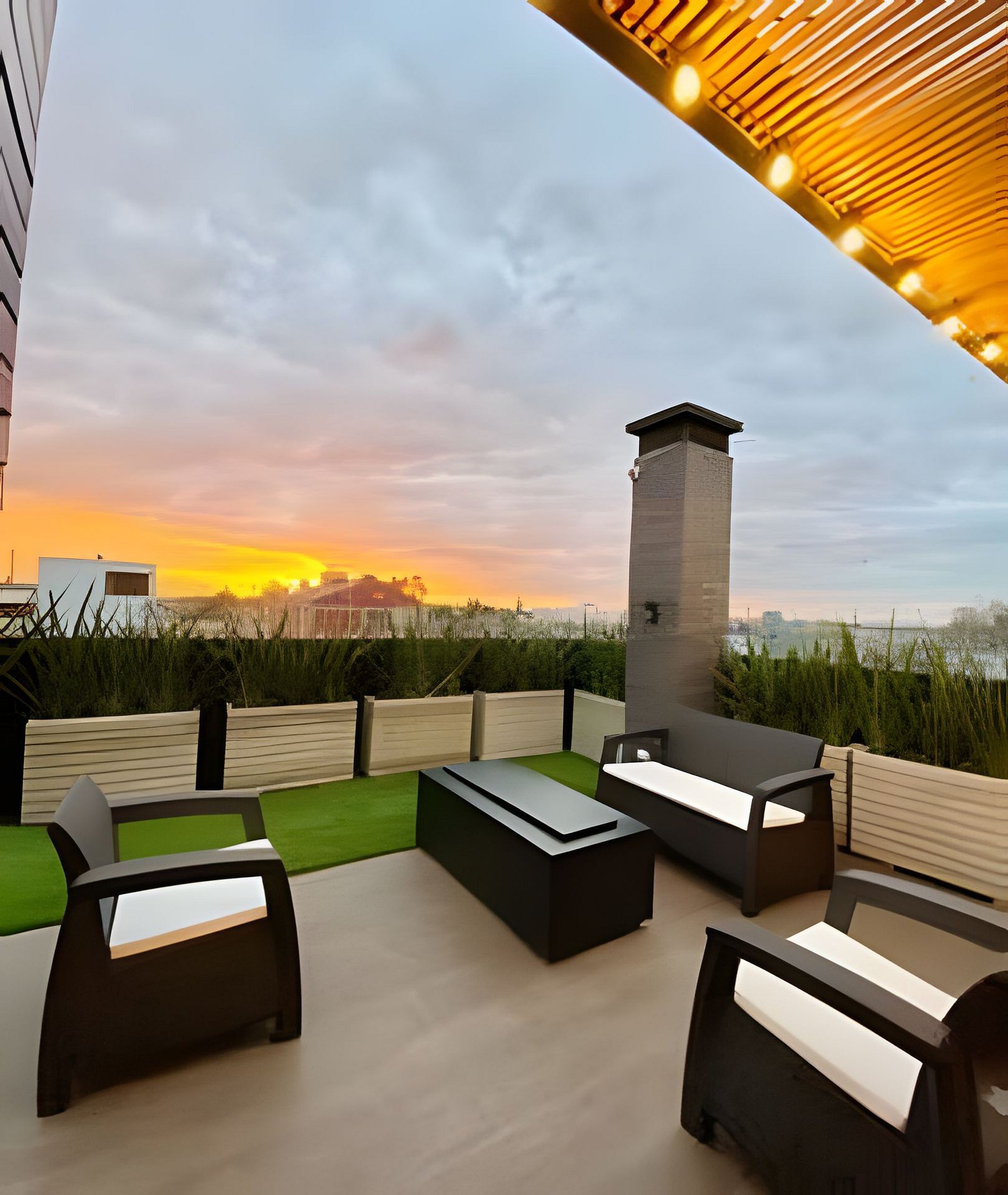 Terraza comunal con vista a la ciudad, perfecta para relajarte, compartir un café o disfrutar de un momento tranquilo al aire libre.