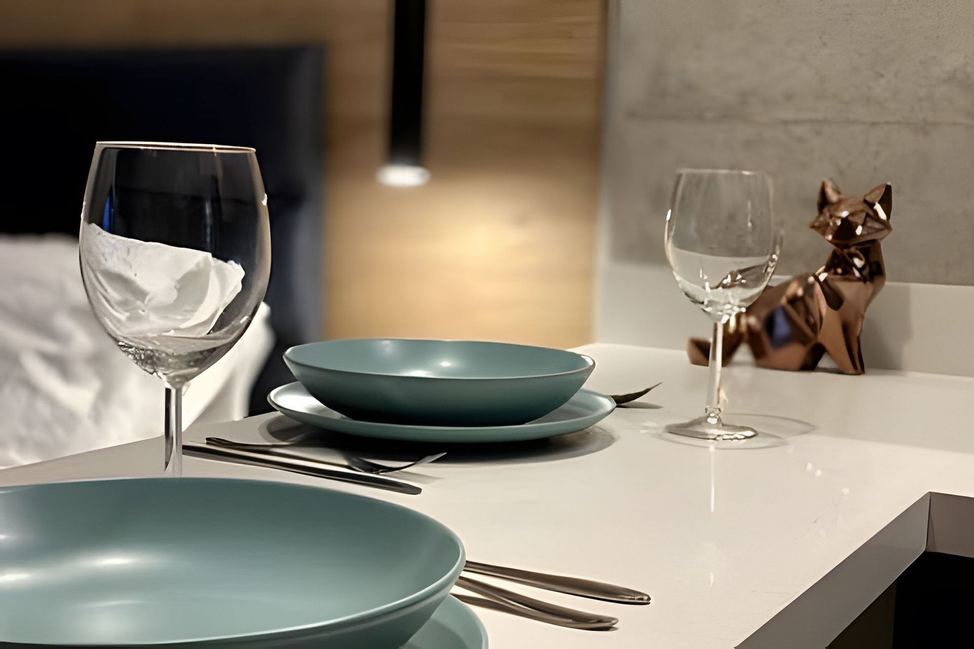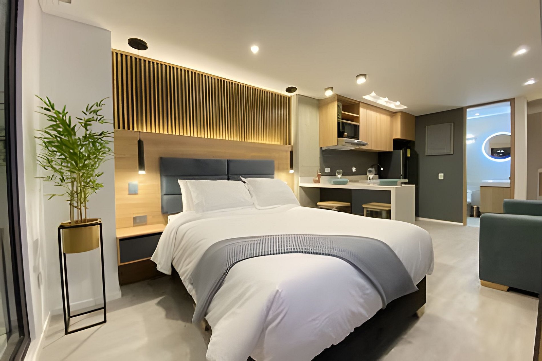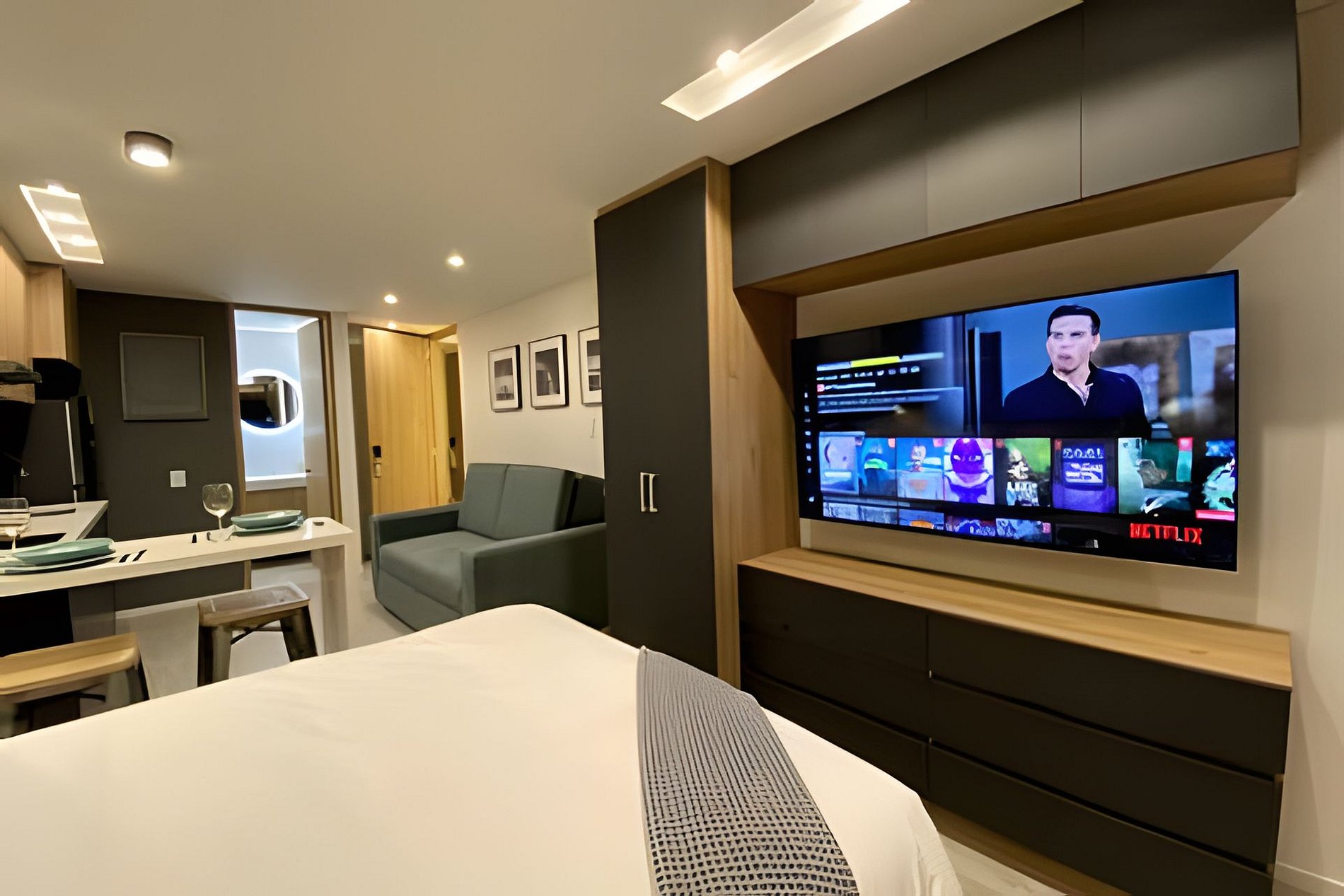 Apartamentos equipados con cocina completa, sala, Wi-Fi de alta velocidad y Smart TV.